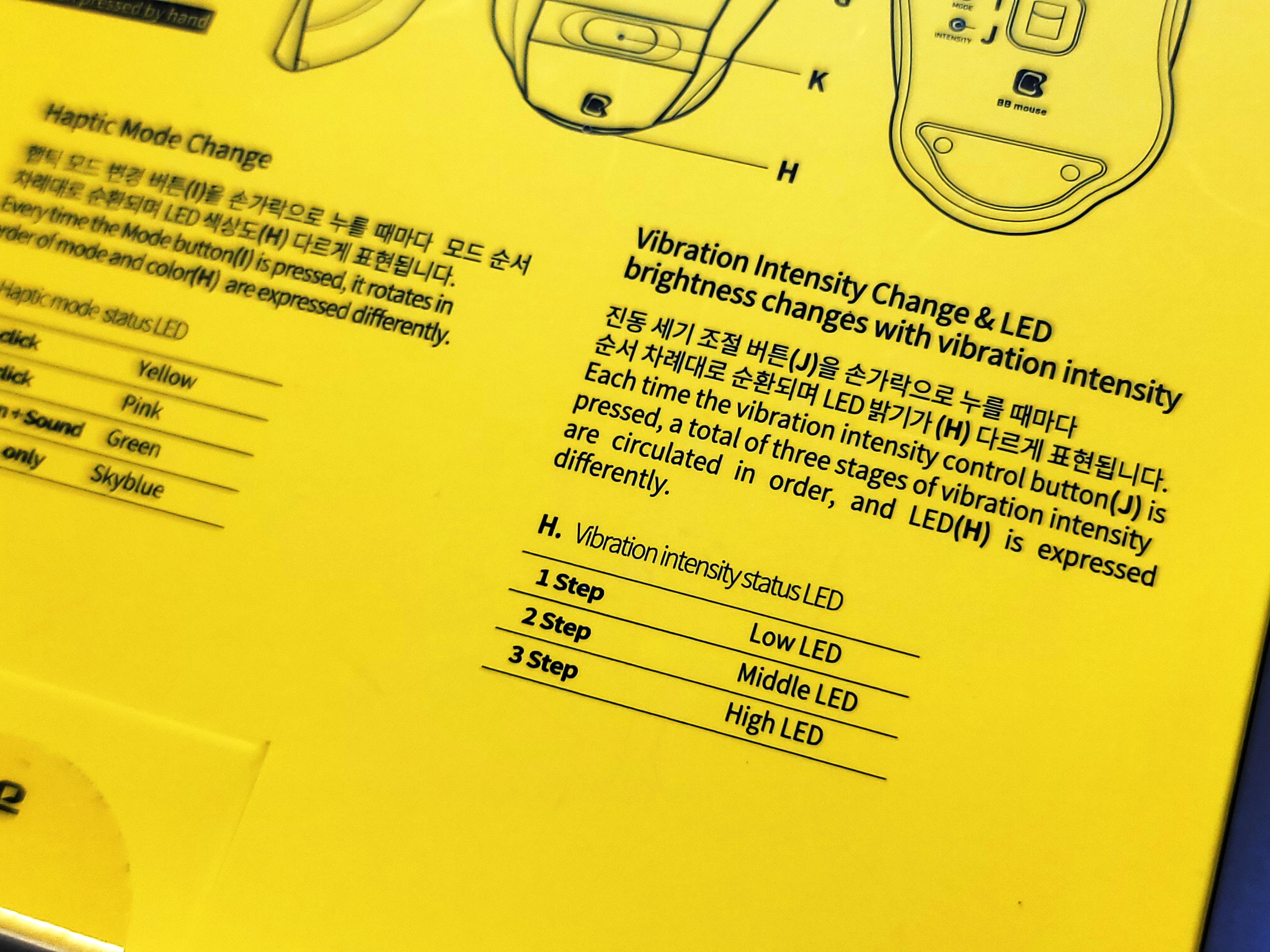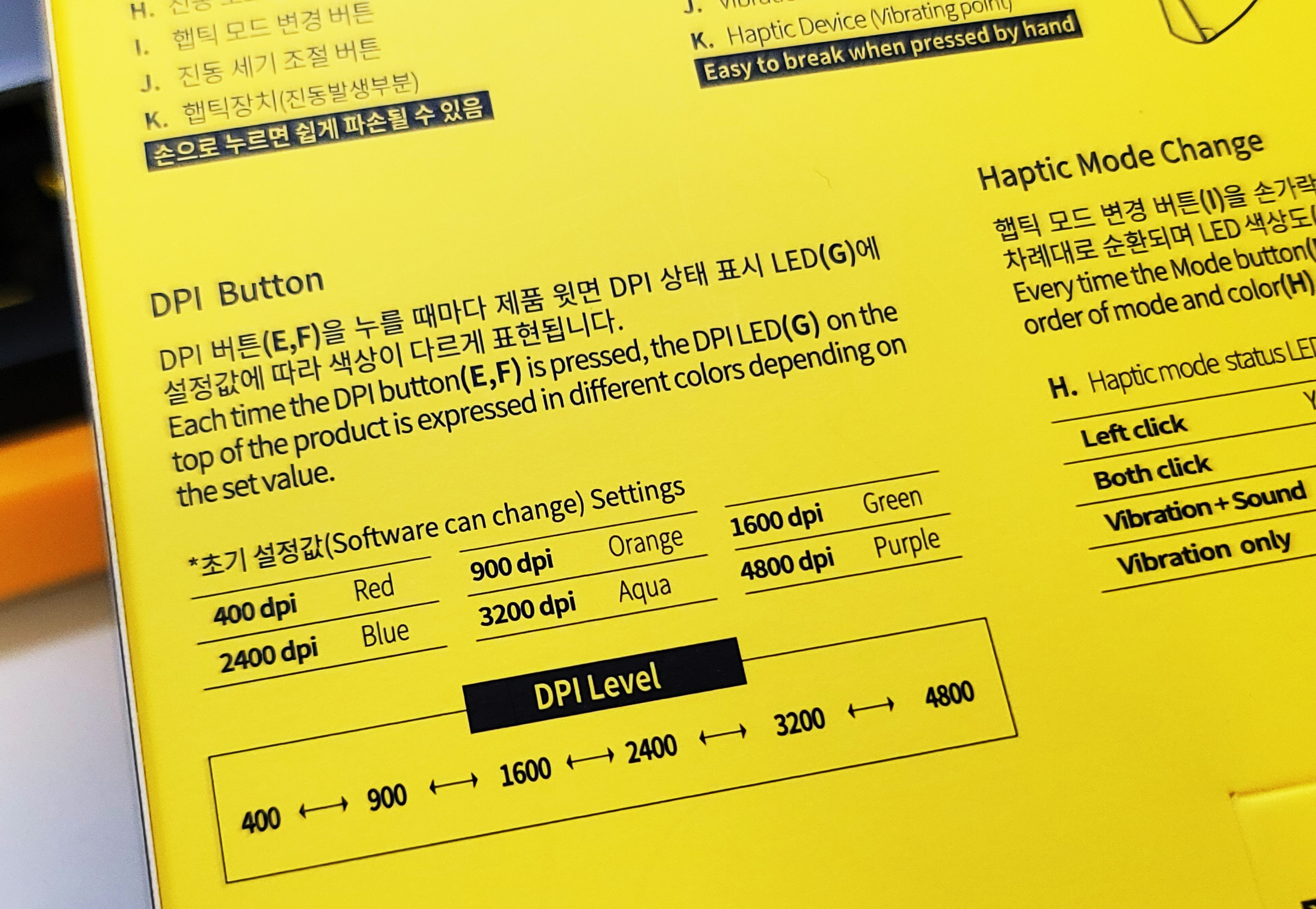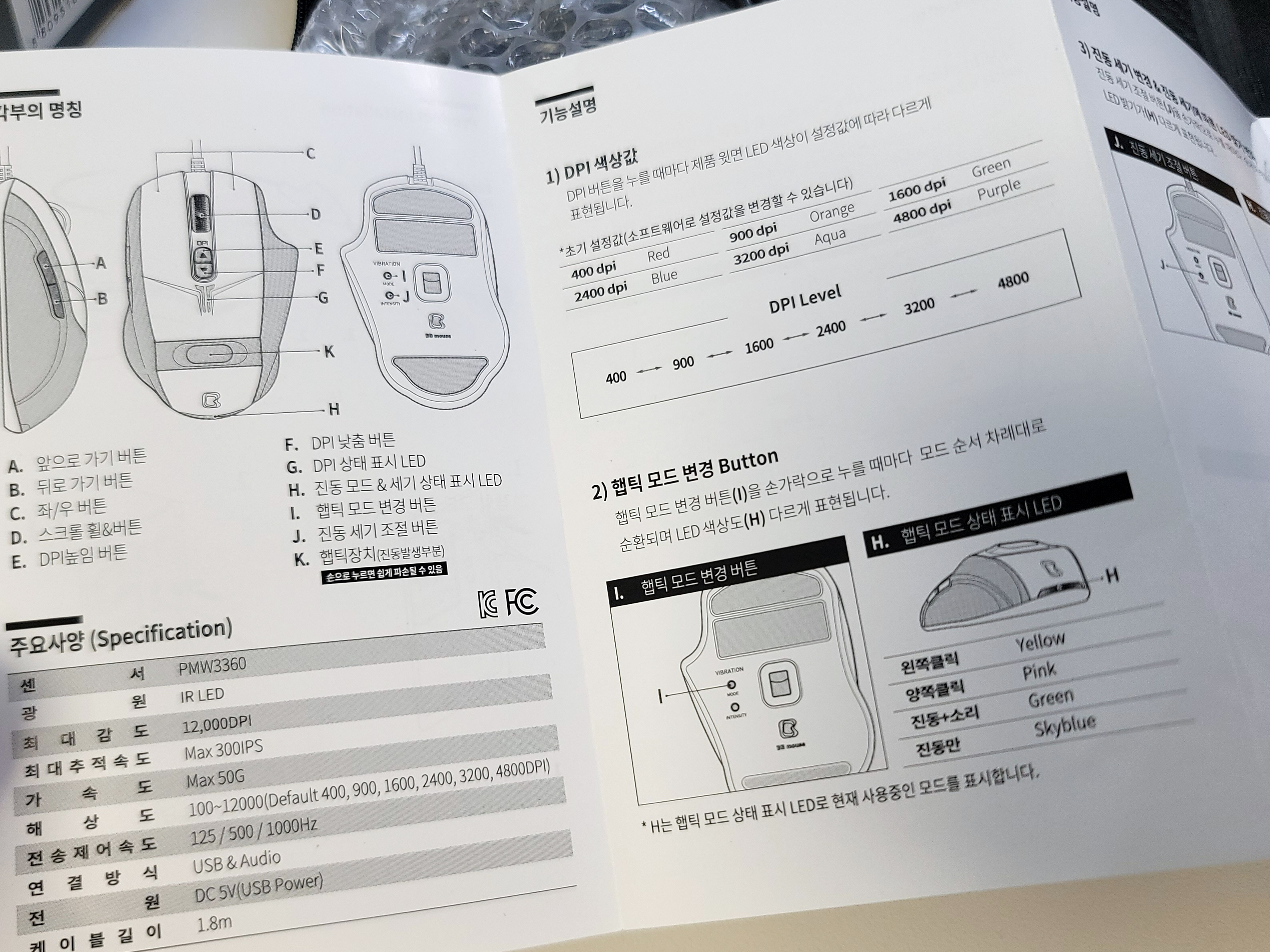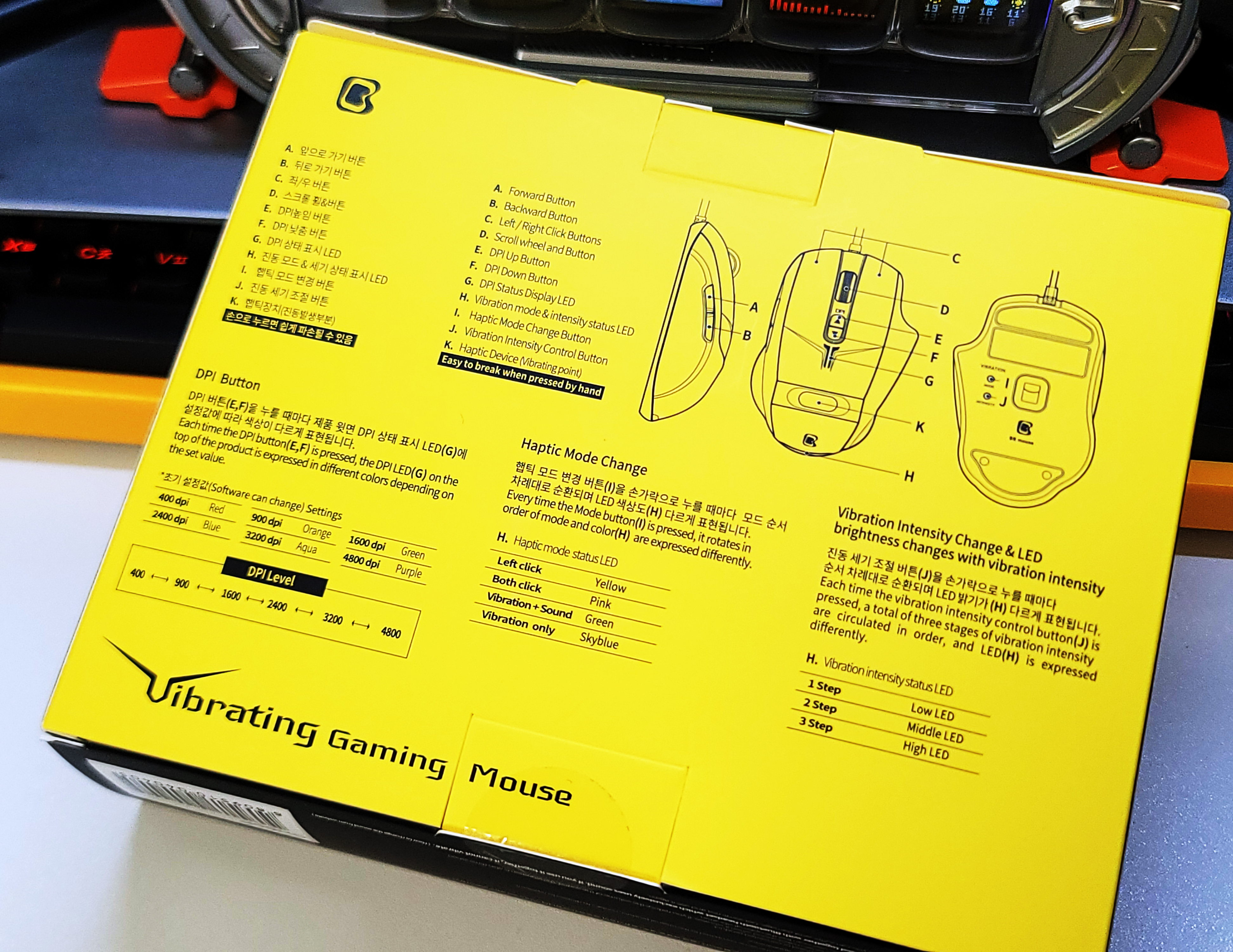 패키지 뒷면에는 각부 명칭 및 LED 색상에 따른 모드, 진동세기, DPI 상태가