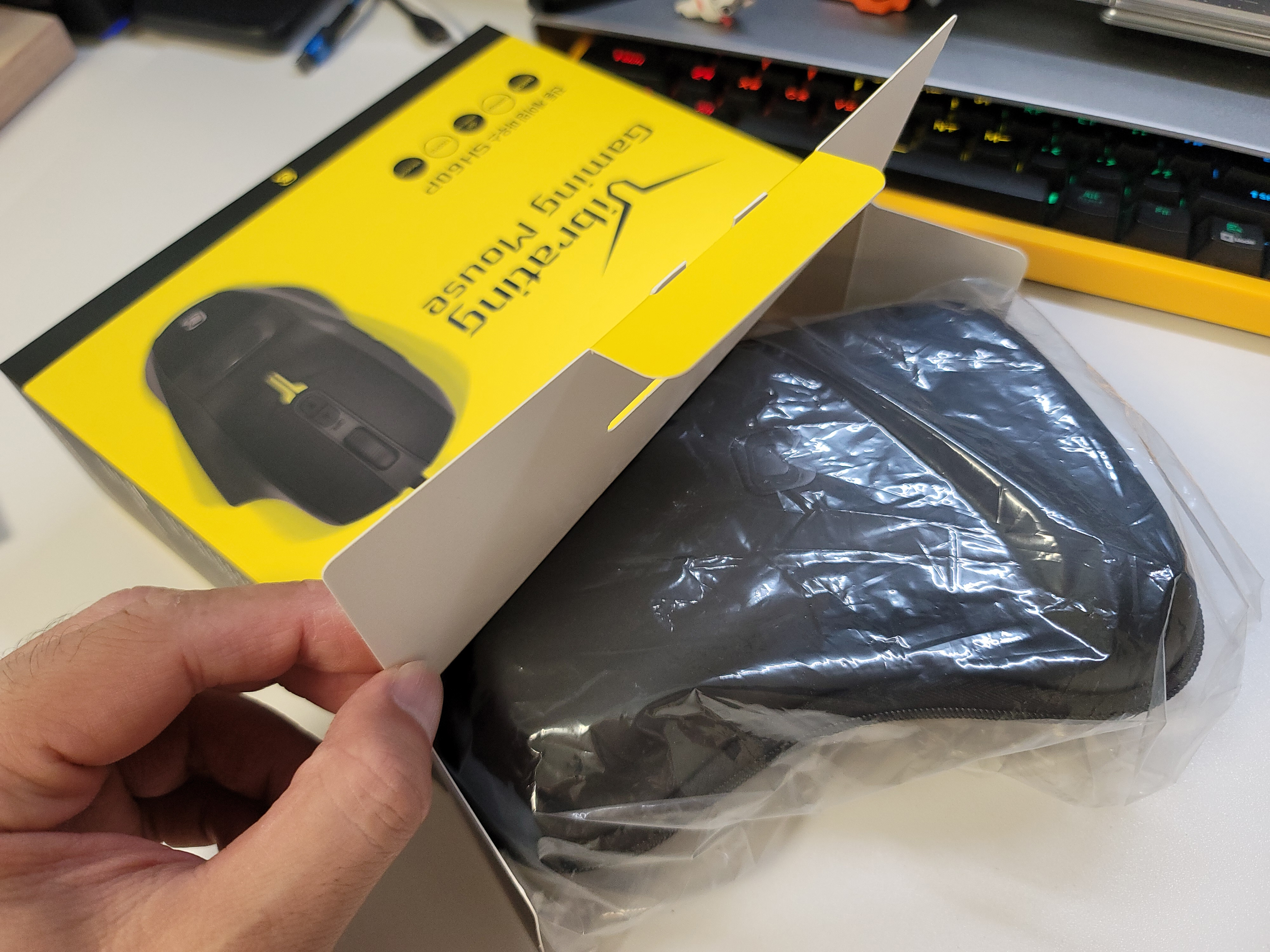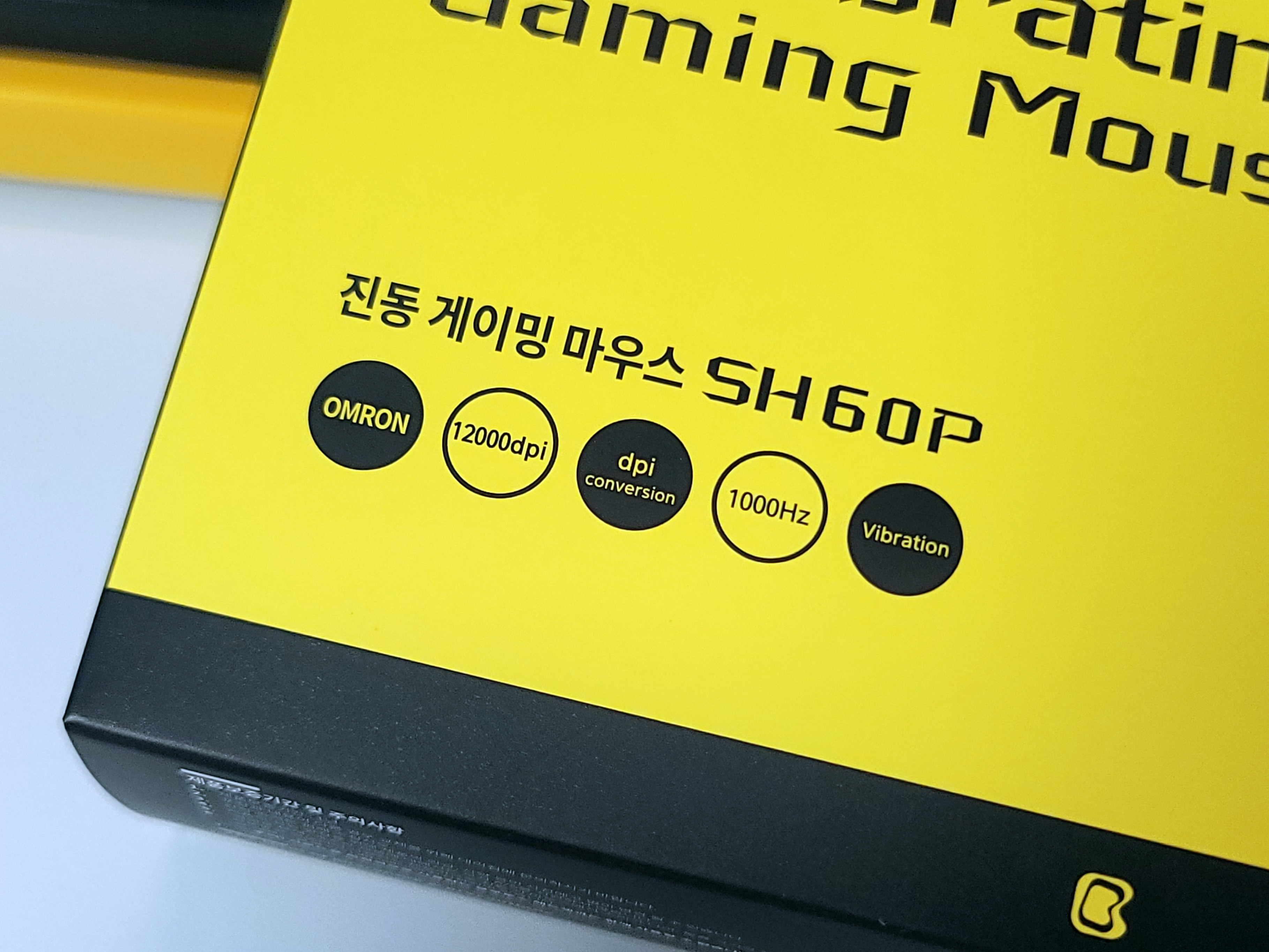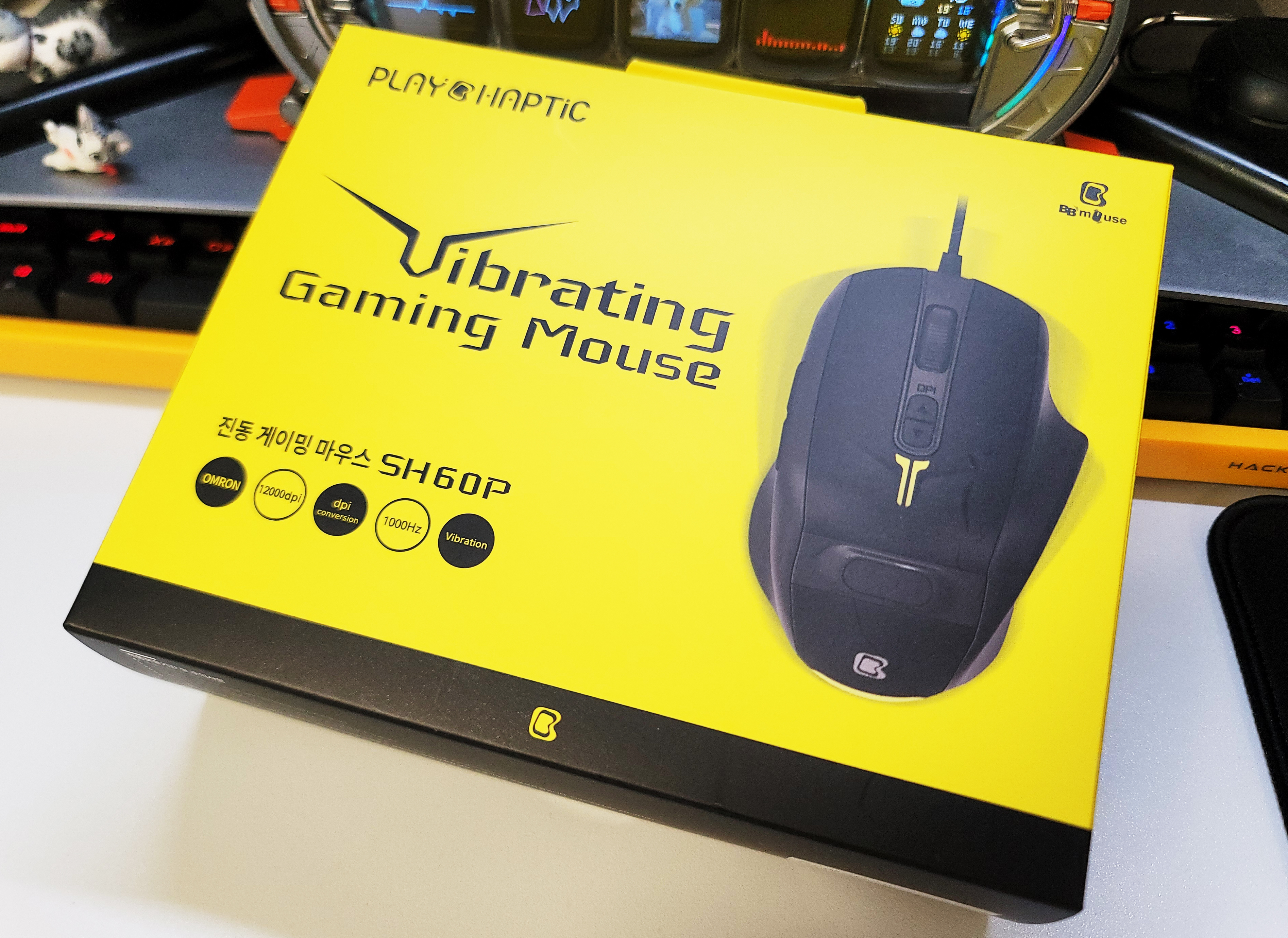노란색 패키지에 진동게이밍 마우스의 간략한 특징이 안내되어 있습니다.